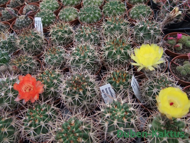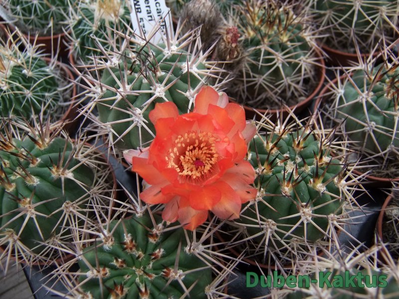Semenáč Acanthocalycium ferrari, dospělý kvetoucí kaktus. "Argentinský ježek", kvete většinou žlutě, někdy jsou květy i Oranžové.