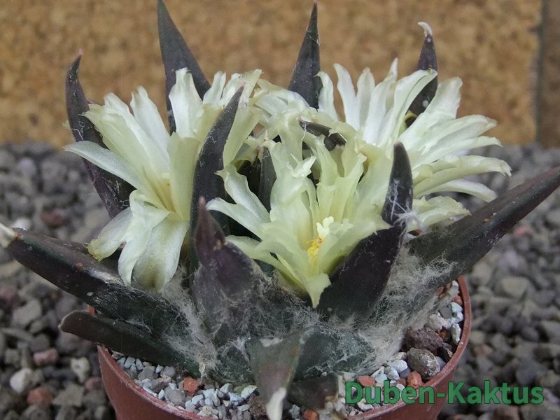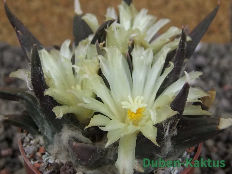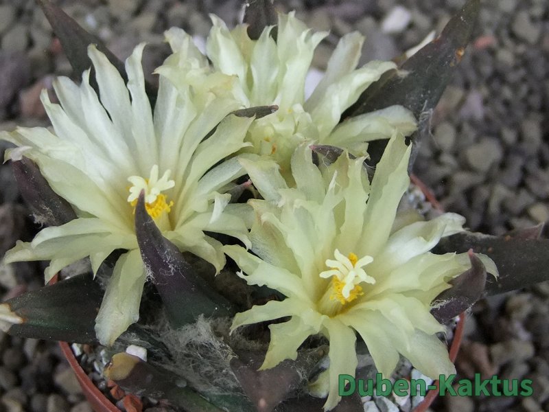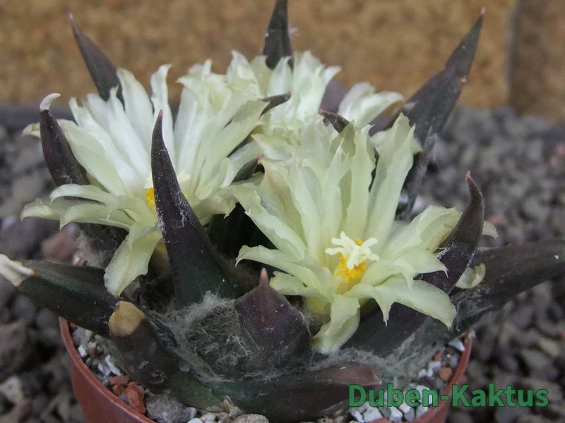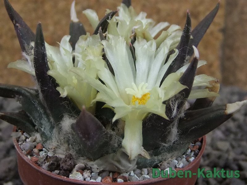 Minimálně 20 let stará rostlina. Vzrůstná forma Ariocarpus trigonus. Výběrov kategorie Ariocarpusů. Kaktusy jsou zde foceny, evidovány a prodávány individuálně. Na posledních fotografiích je porovnání s kaktusem v květináči 5,5 cm.