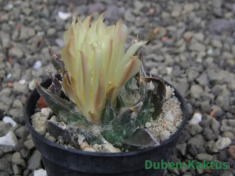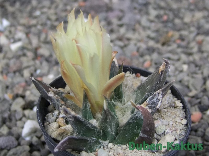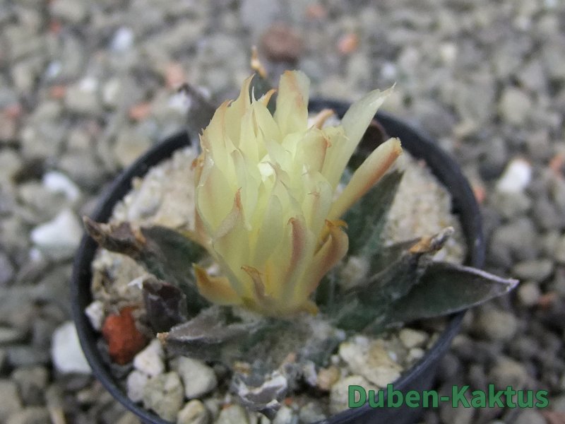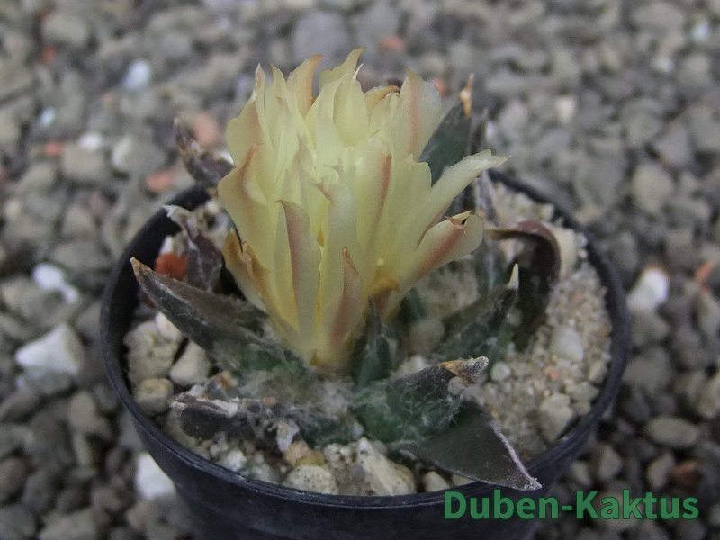 Ariocarpus trigonus horacekii, miniaturní trigonus, odlišný od dalších trigonusů. Kvete jako malý.