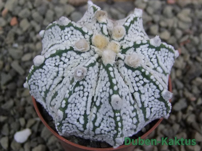 V současné době zavádíme "nové kvalitativní označení rostlin" Astrophytum z Jasenné. Je to především ulehčení naší práce a alesponˇnějaké označení rostliny. Tyto kaktusy od prvního dopadu pylu na pestík vznikly v pěstírně kaktusů Duben-kaktus. Většinou jsou to multihybridy a pokud je nějaká rostlina blíže Astrophxtum niveum nevo capricorna či asterias nebo Super Kabuuto. není lehké označit. Nebo F2 CoKabu x NivMyr 24.6.92 AU.