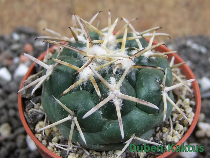Coryphantha poselgeriana od Escalon, pěkná forma na rozdíl od poselgeriana valida od Cerro Bola zelenější, hrubší osten a barevnější květy.