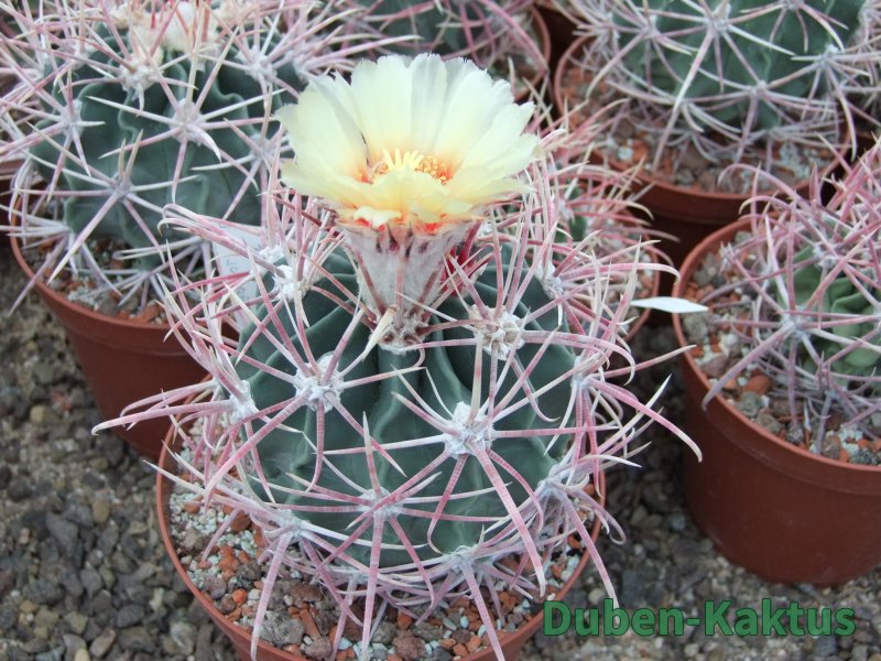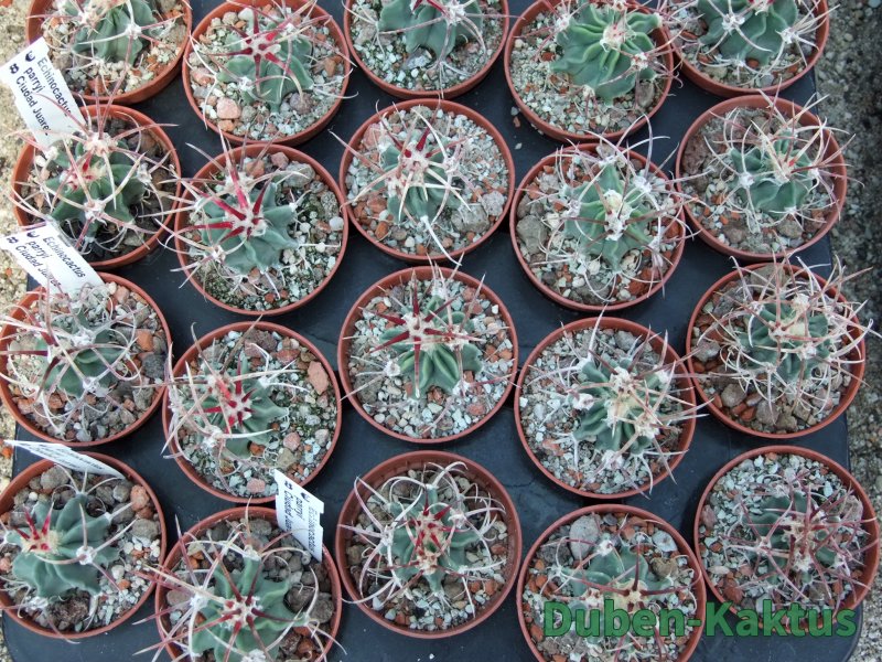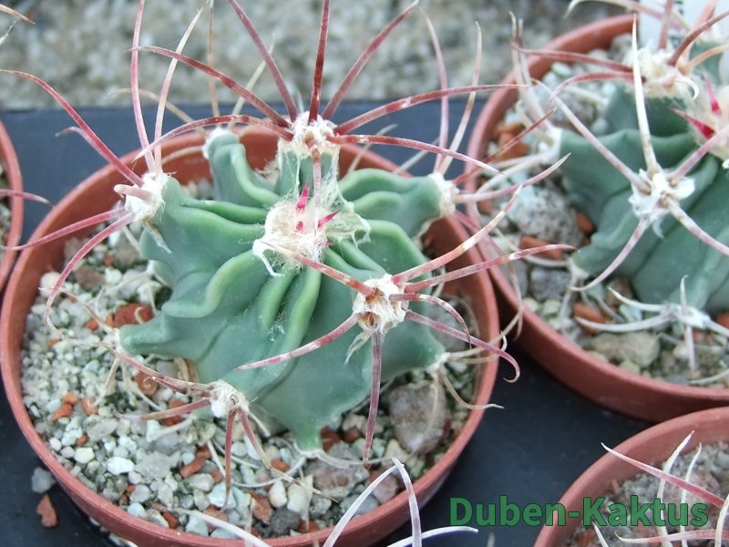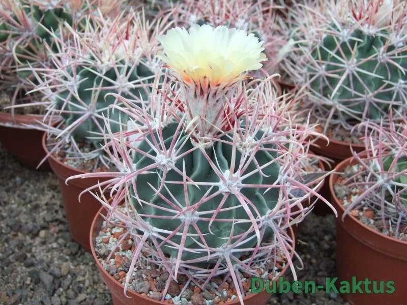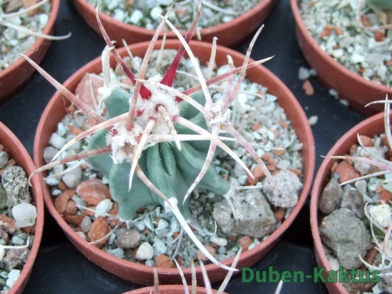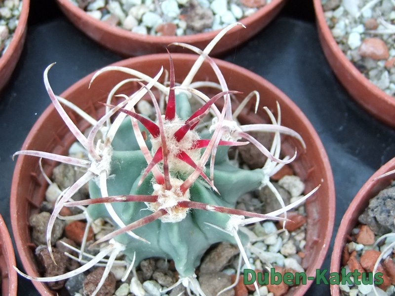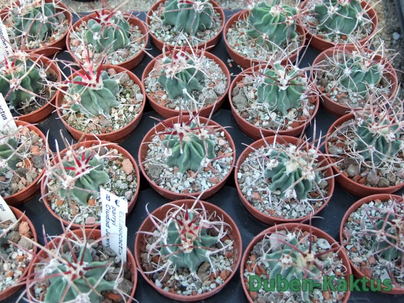 Semenáček Echinocactus parryi. Tyto rostliny poměrně brzy kvetou, na Echinocactus. Semena dobře klíčí, v mládí jsou však choulostivé na kořenové choroby a chutnájí i červcům. Na posledních fotografiích jsou mateční rostliny.