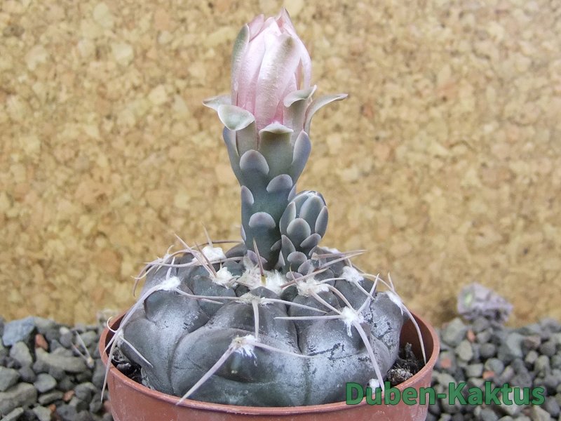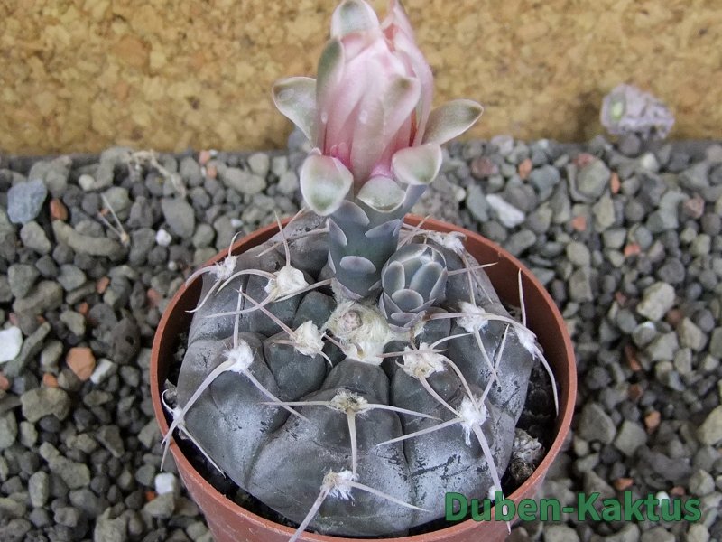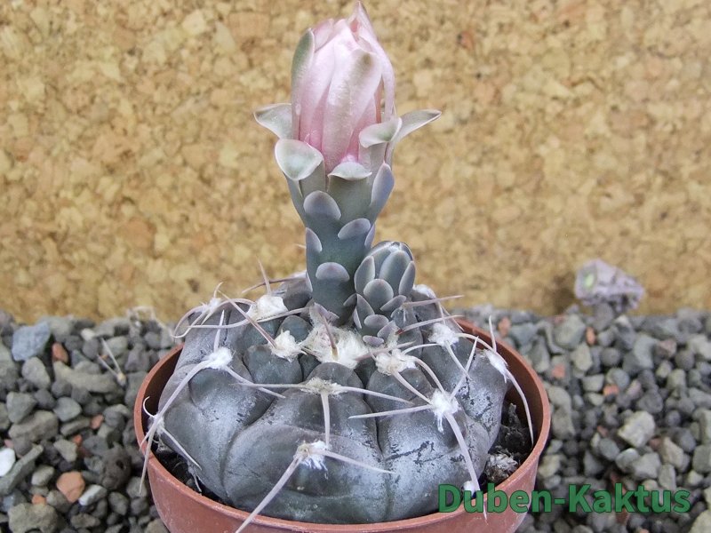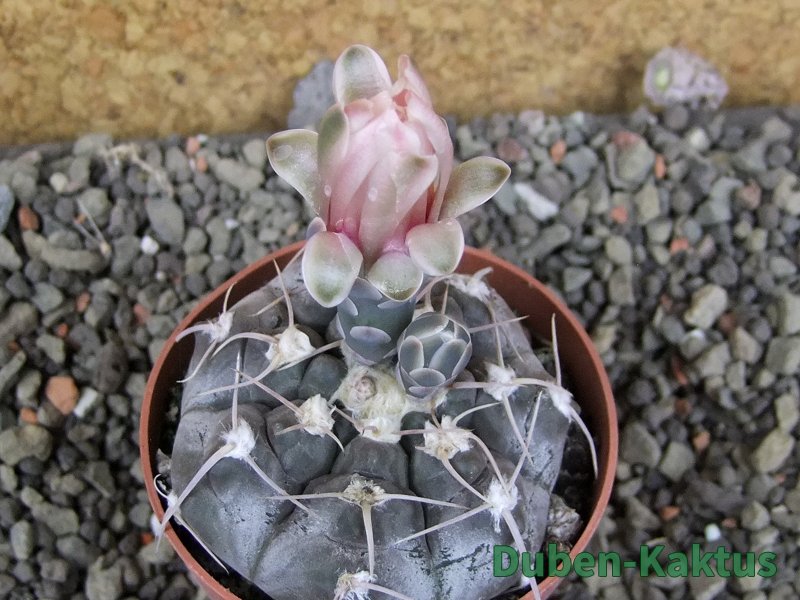 Semenáček kaktusu Gymnocalycium prochazkianum. Výběrová rostlina, minimálně sedm let starý kaktus. Dospělá kvetoucí rostlina.