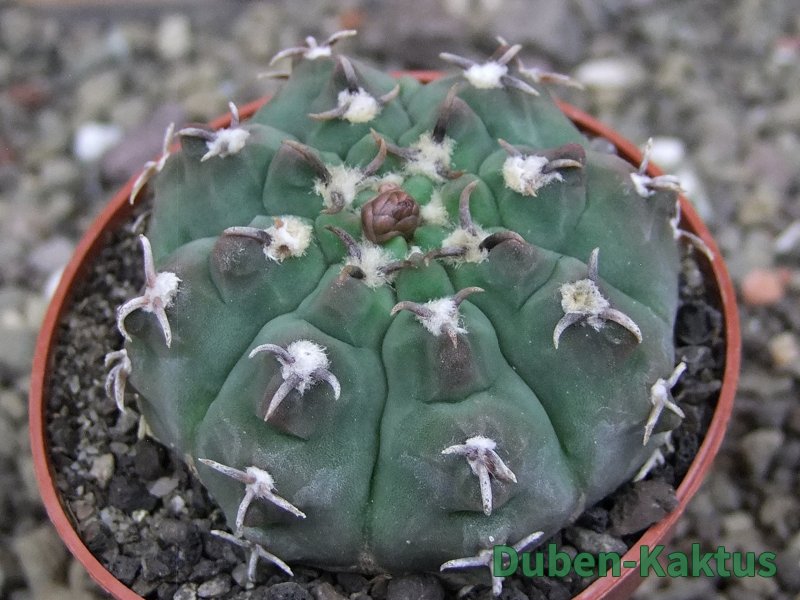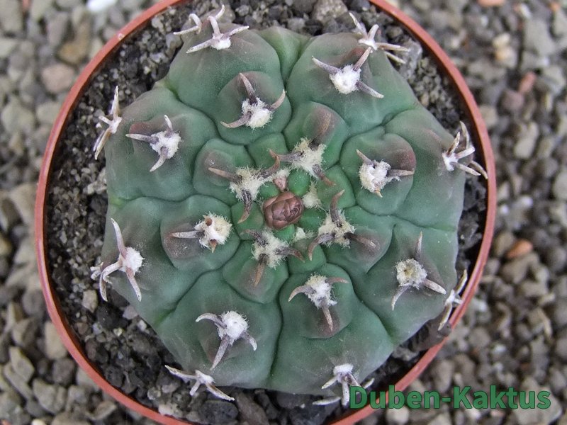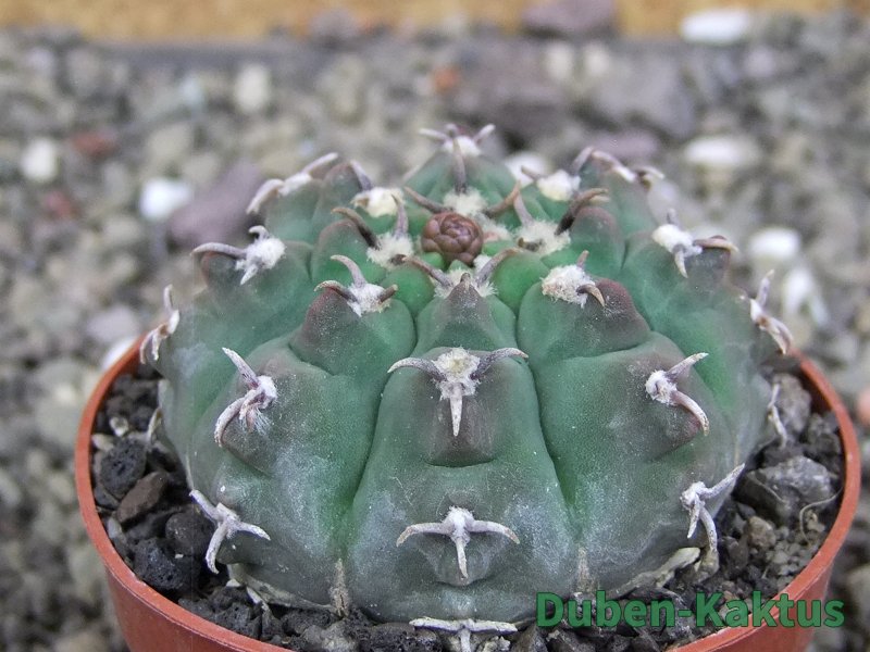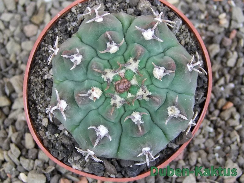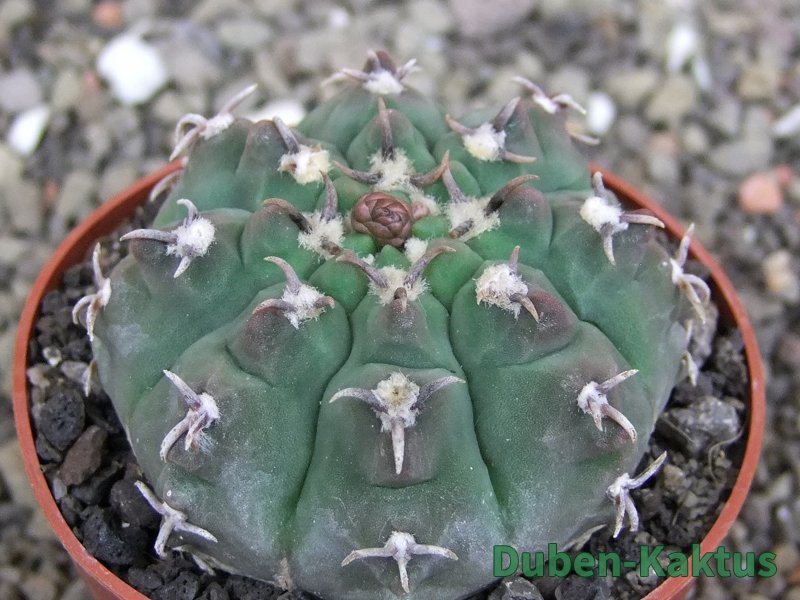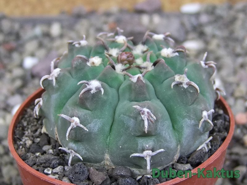 Gymnocalycium watteri unguispinum, postupnou selekcí jsme vyšlechtili Gymnocalycium s krátkými drápkatými trny. Kaktus, který zachovává diskovitý tvar i po 20 letech. Pří výsevu těchto kaktusů je 80% drápkatých rostlin.